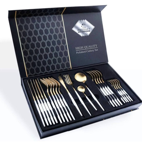 سرویس قاشق چنگال و کارد 24 پارچه استیل طلایی دسته سفید و دسته مشکی طلایی ارسال فوری کد662