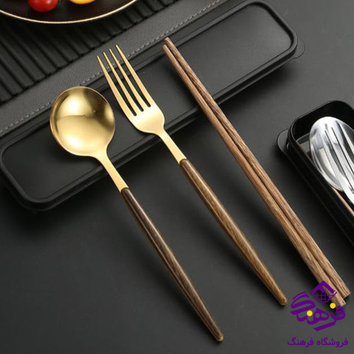 قاشق چنگال چاپستیک استیل طلایی دسته چوبی - آلمانی
