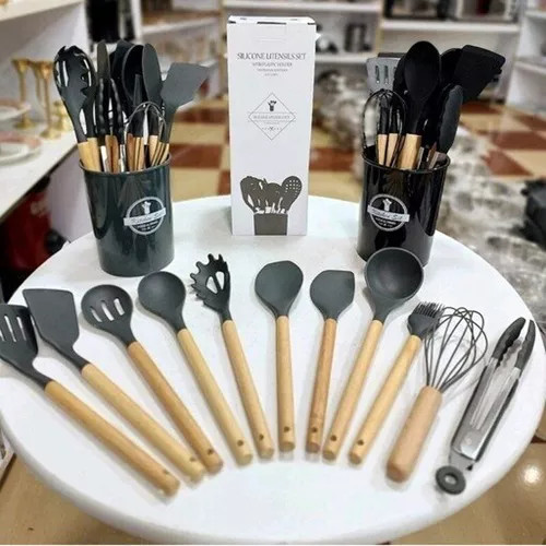 سرویس 12 پارچه سیلیکونی ضد حساسیت دسته چوبی و مقاوم در برابر حرارت شدید با سطل بزرگ فلزی کیفیت عالی ارسال فوری