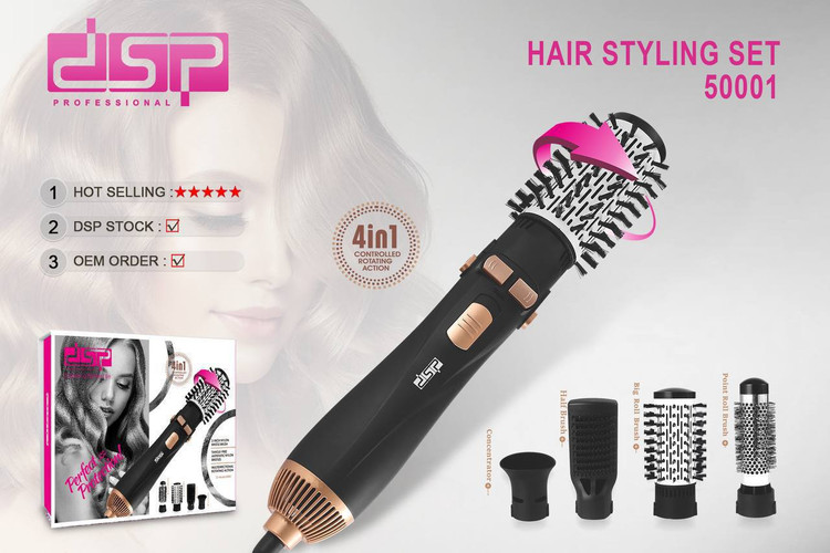 سشوار چرخشی ۴کاره dsp 50001 دارای برس حرارتی و سری چرخشی سری متمرکز کننده(صاف کننده) دارای سری برس مویی نسوز فناوری تولید یون موتور پرقدرت سیم چرخشی طراحی ارگونومیک کیفیت تضمینی