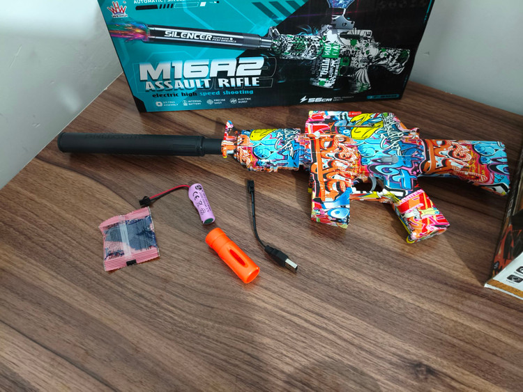 تفنگ مهمات ژله ای که با باتری قابل شارژ کار می کند. تا 200 گلوله را در یک زمان با برد بیشتر از 15 متر بارگیری می کند. از مهمات ژله ای 8 میلی متری A-001 استفاده می کند. مهمات ژله ای لک نمی کند و بعد از شلیک تبخیر می شود.شامل تفنگ، خشاب قابل جابجایی ، باتری قابل شارژ، شارژر USB،بند تفنگ و عینک ایمنی. بسیار مهیج، حتی برای افراد بزرگسال.