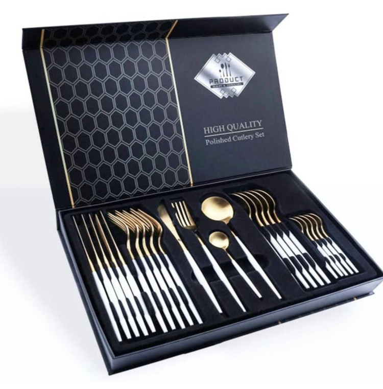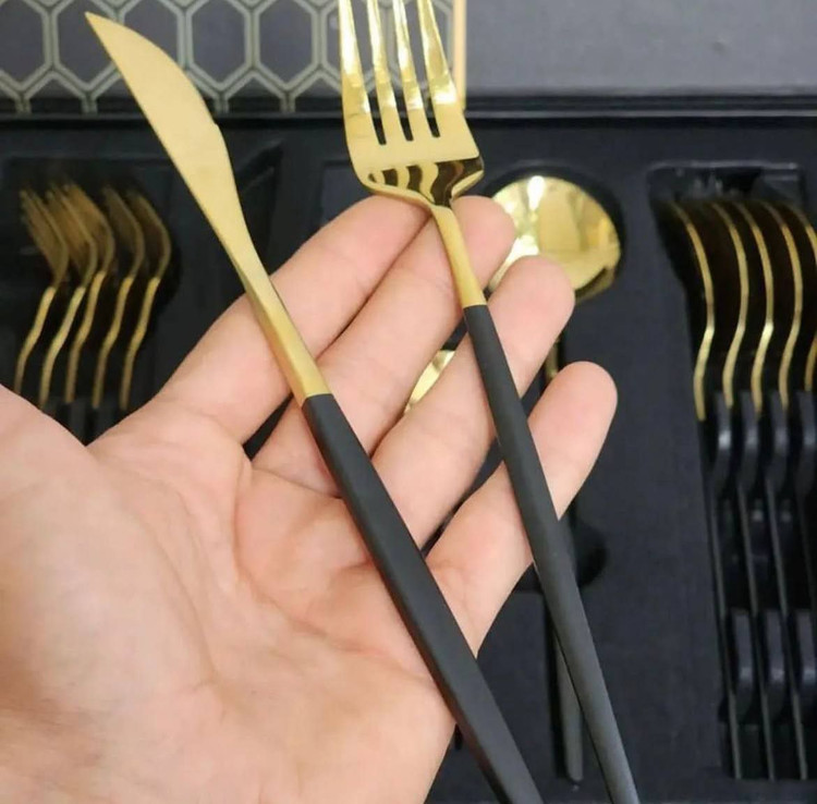 سرویس قاشق چنگال و کارد 24 پارچه استیل طلایی دسته سفید و دسته مشکی طلایی ارسال فوری کد662
